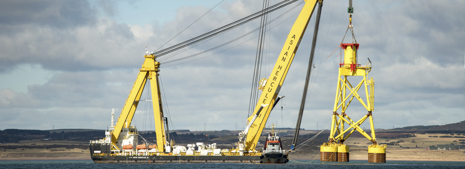 The Aberdeen Offshore Wind Farm is also known as the European Offshore Wind Deployment Centre. The Windfarm is located approximately 3 kilometers off the coast of Aberdeen, United Kingdom. With its eleven wind turbines it has a total capacity of 93.2 MW (2 * 8.8 + 9 * 8.4 MW). The wind farm features the world’s most powerful wind turbine at date, exporting power through 66 kV cables and supported on suction bucket jackets. This novel foundation type constitutes one of the major innovations of the Aberdeen Offshore Wind Farm project, which is being used here on a large scale for the first time. In essence, a suction bucket jacket is a steel structure welded to three large, inverted steel buckets which are lowered onto the seabed. The water is pumped out of the steel buckets, creating negative pressure driving the buckets to the desired penetration into the seabed.
