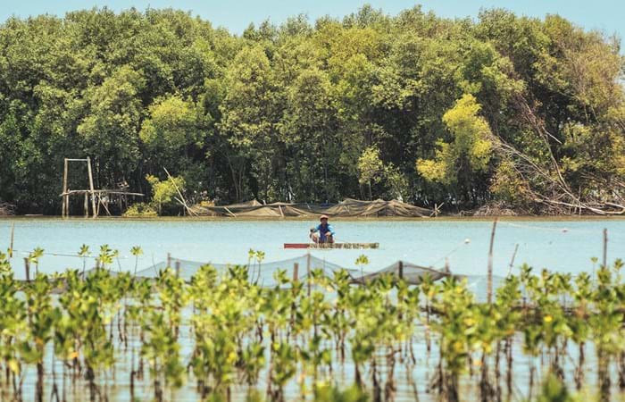 to retreat several kilometers. With a sophisticated combination of mangrove restoration, small-scale engineering and sustainable land use, the shore bed level was restored, making mangrove restoration
