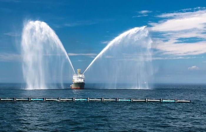 Boskalis transported and installed The Ocean Cleanup’s North Sea prototype, the first ocean cleanup system ever tested at sea, 23 km (12 NM) off the Dutch coast. The goal of the test is to see how the floating barrier design is able to cope in extreme weather at sea during a 12 month period.
